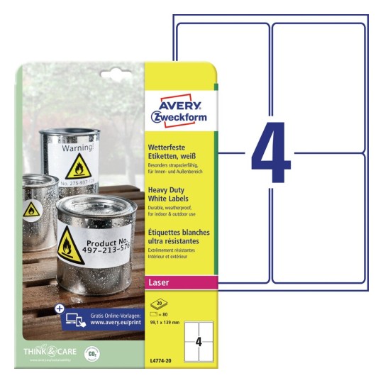 The white, weatherproof labels L4774-20 in the format 99,1x139mm for laser printer from AVERY ZWECKFORM are particularly hardwearing, also for outdoors. 80 matt-coated polyester film labels on 20 sheet. The strong permanent adhesion makes them perfect for weatherproof, reliable and durable labelling. The heavy-duty polyester film labels are oil-, dirt-, UV- and temperature resistant (-20°C to +80°C) and water- and tear proof. They are significantly more hard-wearing than standard paper labels. Design and print your weatherproof labels the quick and easy way - for the free Avery Zweckform templates and software please visit www.avery-zweckform.eu/print or use the templates integrated in the Microsoft® Office packages. Optimum suitability for laser printers.
