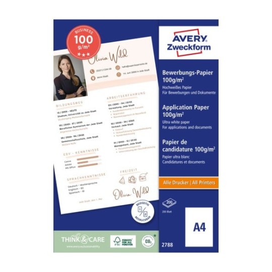With the flyer paper 2789-40 from AVERY ZWECKFORM in the format DIN A4 you can design and create your own flyers for professional sales literature with small print runs. 40 sheet of paper per pack. The flyer paper has a glossy coating on both sides for a high quality look and quick drying time. The 180 g print paper is stable and opaque - perfect for both-sided printed flyers. FSC®certified paper from responsibly managed forestsn. Flyer paper suitable for all standard inkjet printers.